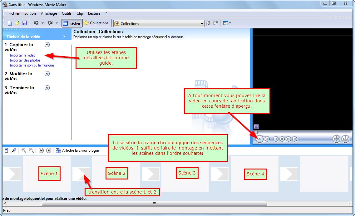 Lancez le logiciel Windows Movie Maker. Les différentes sections de l'écran principal sont détaillées sur l'image ci-dessous: